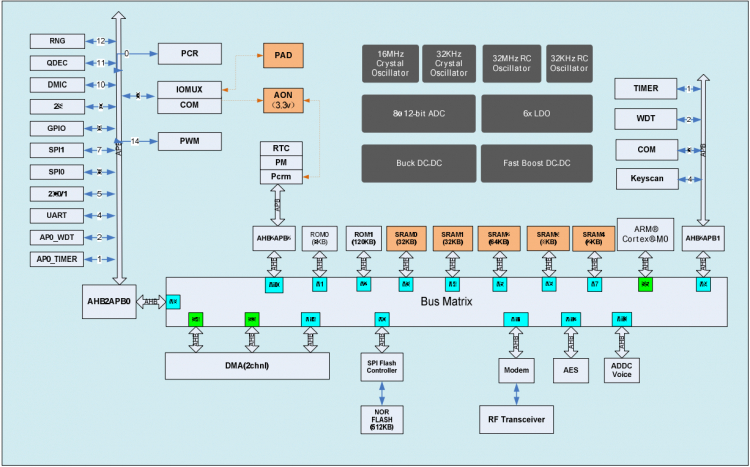 PHY6202是一颗32位ARM Cortex -M0 芯片,具有128KROM,138K SRAM,和256/512KFlash。其内置2.4GHz的无线收发机支持低功耗蓝牙(BLE),ANT和私有2.4GHz协议栈PHY6202可以作为独立系统运行,也可以作为主机MCU的从设备,通过I2C / UART 接口提供蓝牙功能。