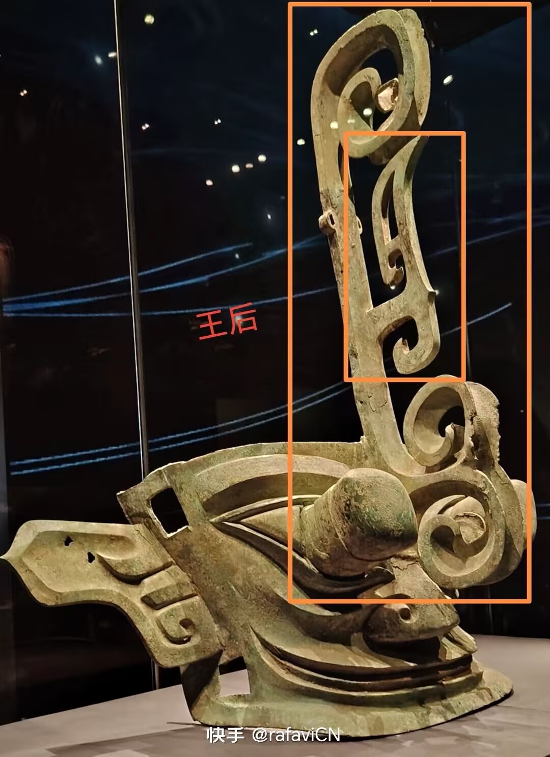 王后 青铜纵目面具额部构件、神坛侧部构件 面具 / 神坛的柱状 / 枝状纹饰,个人解读为 “王后” 的身份符号