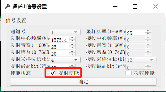 4.5 选择通道1信号设置,进入通道1参数设置页面,选择“发射使能”