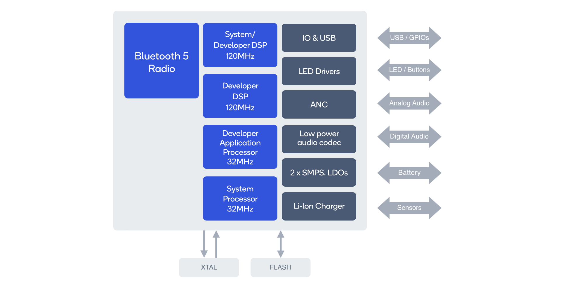 Audio Technology: Qualcomm TrueWireless™ Stereo technology, Qualcomm TrueWireless™ Stereo Plus technology, Qualcomm® Active Noise Cancellation (ANC) technology, Qualcomm® Broadcast Audio technology, Qualcomm® aptX™ audio technology, Qualcomm® cVc™ audio t