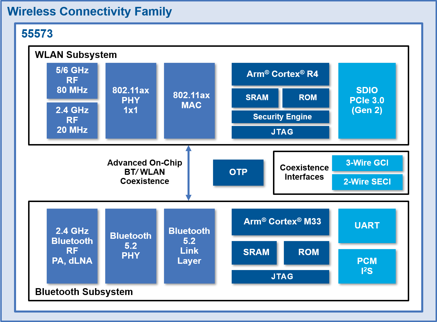 • CYW55571: Wi-Fi 6E, 1x1 (80MHz)