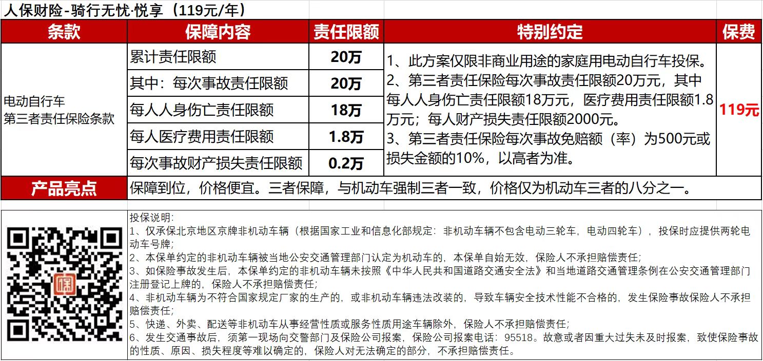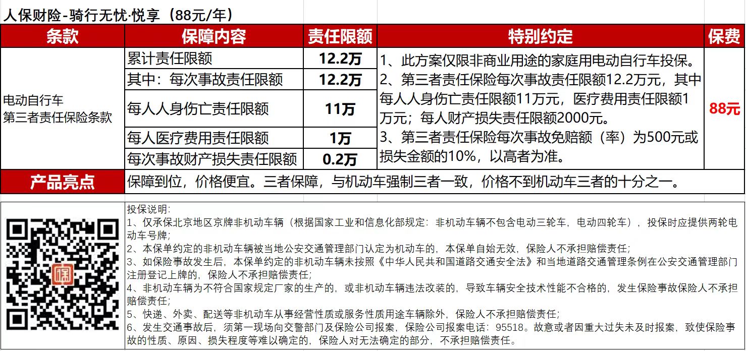 人保财险 - 骑行无忧.悦享(88元/年)   - 电动自行车第三者责任保险 (限北京家庭自用电动自行车)