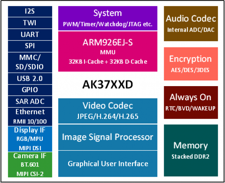 安凯AK37D系列处理器采用ARM926EJ-S内核,集成DDR2 SDRAM存储器、摄像头接口、图像处理器、视频编码预处理器、视频编解码器、音频ADC/DAC、USB2.0主从控制器、MMC/SD/SDIO控制器以及丰富的外设接口,具有很高的集成度,大大降低了产品的功耗和物料成本,同时具备高性能的多媒体处理能力。