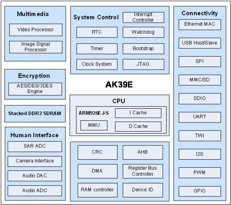 安凯AK39E系列处理器采用ARM926EJ-S内核,集成DDR2 SDRAM存储器、摄像头接口、视频编码预处理器、视频编码器、图像处理器、音频ADC/DAC、USB2.0主从控制器、MMC/SD控制器以及丰富的外设接口,具有很高的集成度,大大降低了产品的功耗和物料成本,同时可提供高性能的多媒体处理能力。
