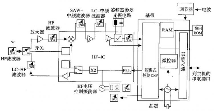 蓝牙的实现成本而言,选择生产工艺和实现需要的元件数量也许是争论最多的问题。为此大多数蓝牙芯片供应商决定采用多芯片方案,其中基带DSP微控制器单元用CMOS技术生产,HF功能需要的模块用双极技术生产见图1。这个方案无疑简化了芯片设计,但它有许多缺点,特别是涉及所需要的元件数量及印制电路板上所需空间位置和系统集成的问题,所有这些问题直接造成实现成本较高。