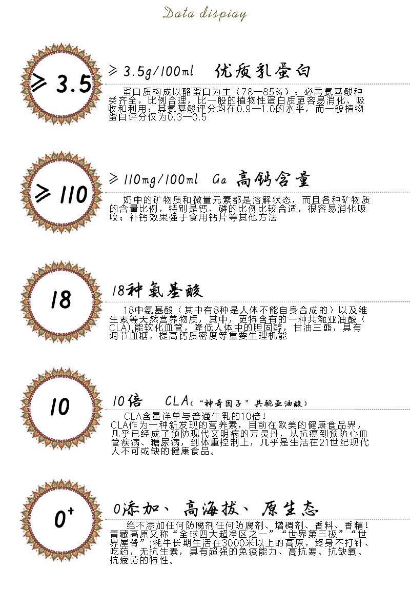 18 amino acids (8 of which can not be synthesized by the human body itself) and vitamins and other natural nutrients, especially a conjugated linoleic acid (CLA can soften blood vessels, reduce cholesterol and triglyceride in the human body, regulate blood glucose, improve calcium density and other important physiological functions.